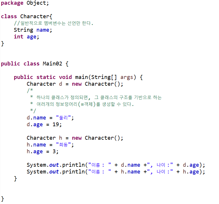 - 앞 예제(Main01.java)는 객체를 생성함과 동시에 객체 안에 name 변수와 age변수가 할당된 값을 포함하게 된다.