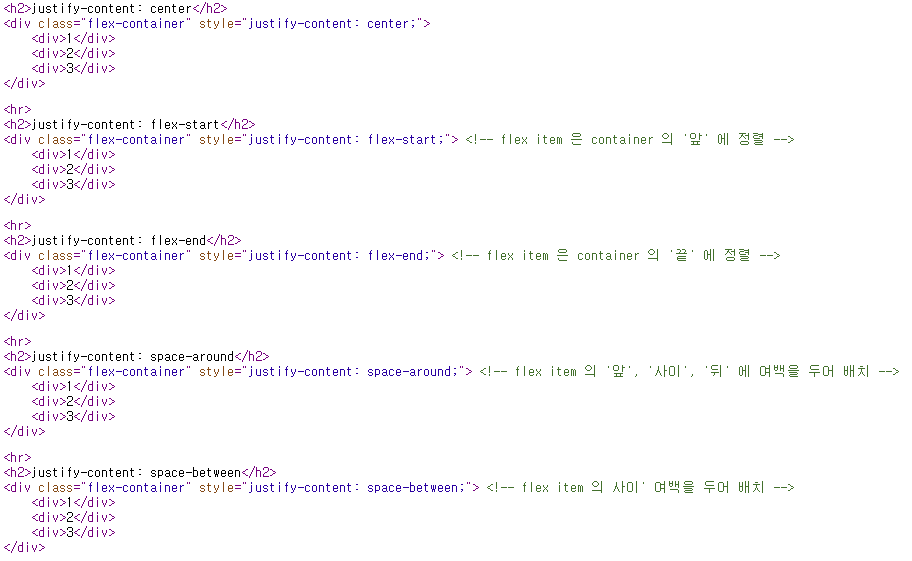 > center, flex-start(디폴트), flex-end, space-around, space-between