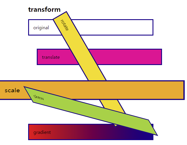 - 이동(translate), 확대/축소(scale), 회전(rotate), 경사(skew) 등을 만들 수 있음