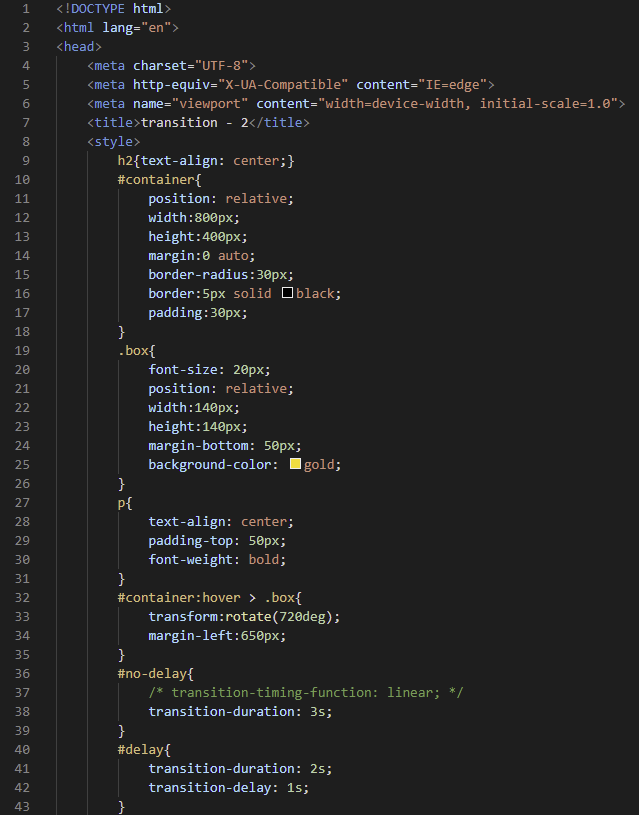 - ease : 전환효과가 천천히 시작 ~ 빨라졌다가 ~ 천천히 끝(ease-in, ease-out, ease-in-out)