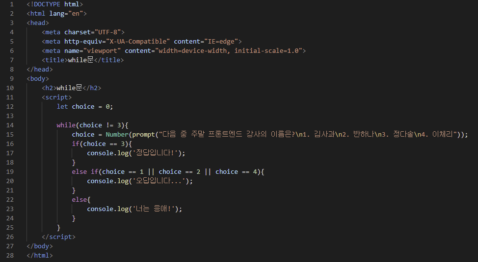 - while문 뒤의 () 안에는 조건식, 즉 Boolean타입의 값이 와야한다.