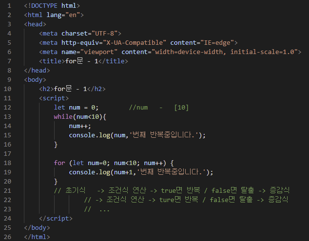 초기식 : 변수를 하나 선언해준다. 내부에서 그 변수로 변하는 값을 표현할 수 있다.