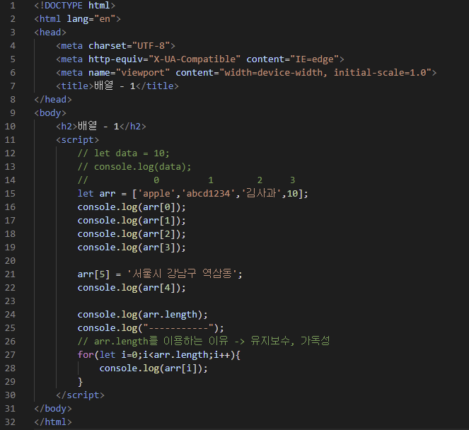 인덱스 : 배열에서의 위치를 가리키는 숫자