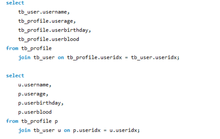 컬럼명 별칭, 컬러명 AS 별칭 / from 테이블명 별칭