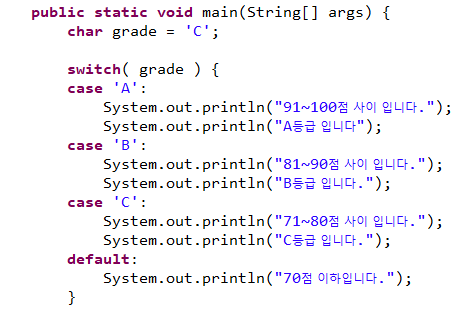 - switch문은 하나의 변수(기준값)에 대한 여러가지 case를 정의하는 구문이다.