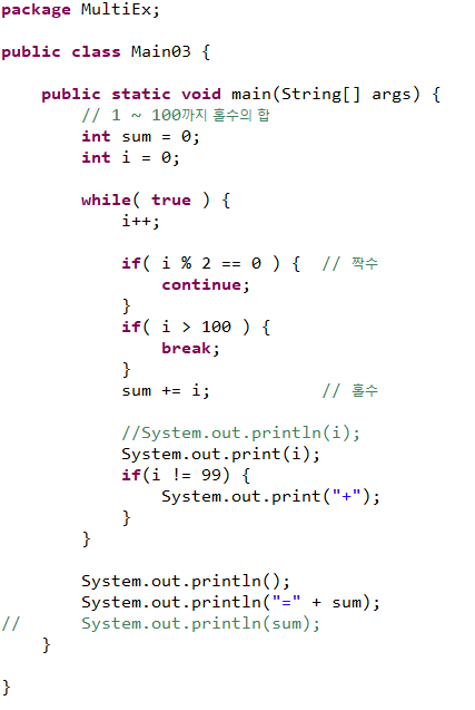 - continue : 실행 흐름이 증감식 또는 조건식으로 강제 이동한다.