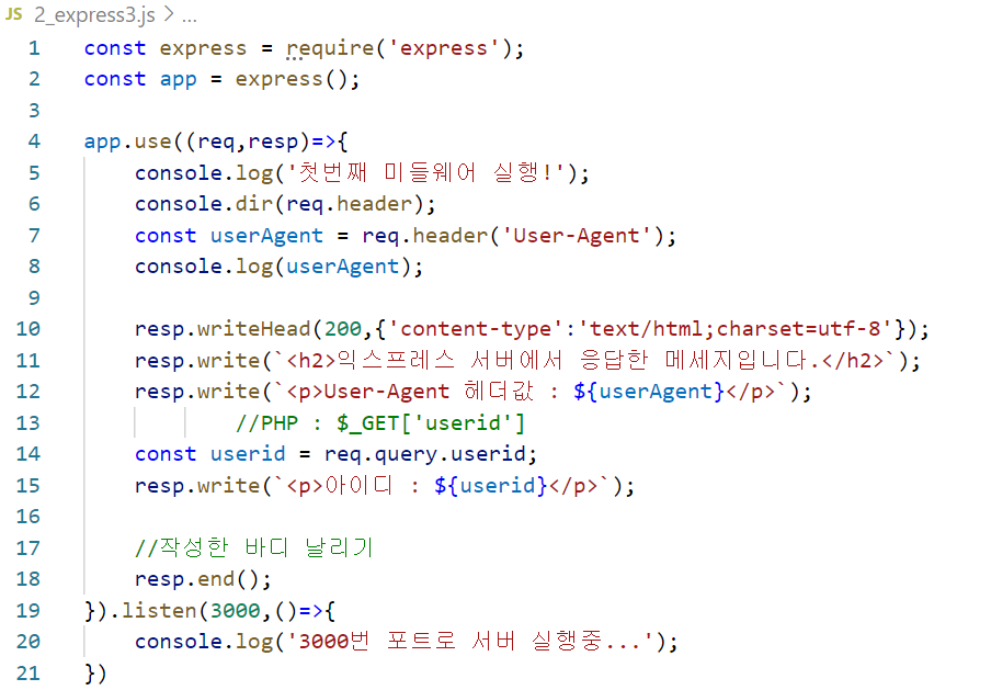 req.query.키 : 클라이언트에서 GET 방식으로 전송한 요청 파라미터를 확인