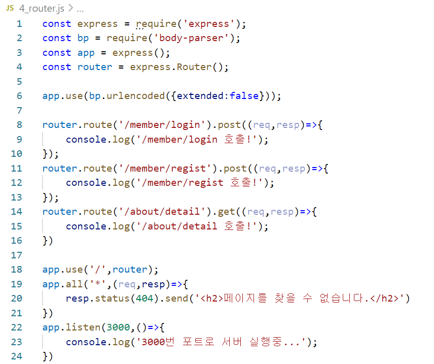 객체명.route('/요청URL').post(호출할 함수);