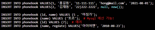 INSERT INTO phonebook (id, name, phonenum) VALUES (3, '홍길동', '010-1111-2222');