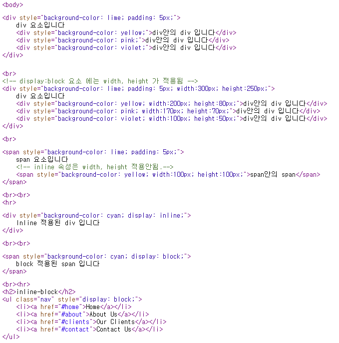 ※ 위 4개 정도만 디폴트가 inline 이고 나머지는 block 이라 생각해도 됨.
