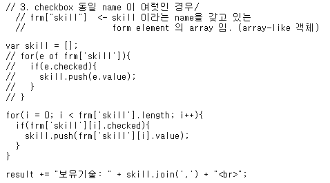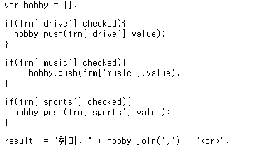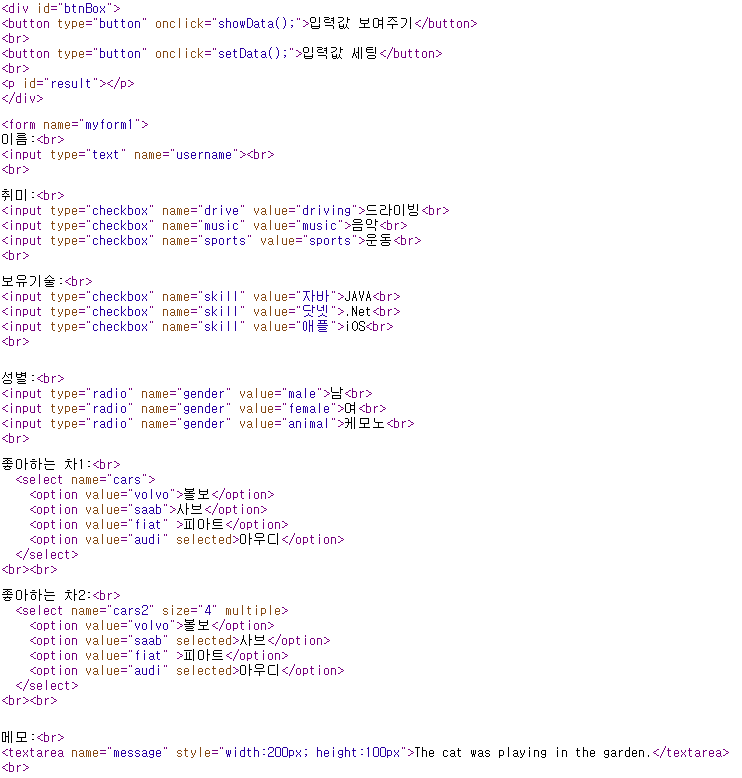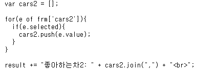 result += "좋아하는차1: " + frm['cars'].value + "<br>";
