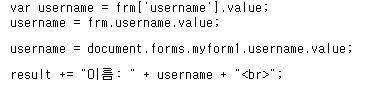 JavaScript 로 다양한 form element 들의 '값을 가져 올수도' 있어야 한며,