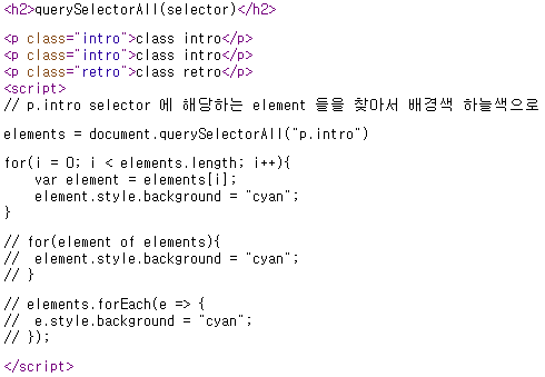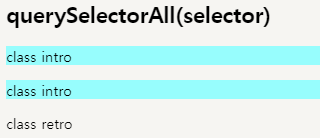 * querySelectorAll(selector) : 'CSS selector' 의 'element들' 을 배열로 리턴