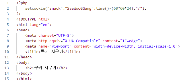 쿠키 만료시간을 0 또는 과거시간으로 변경해주면 자동으로 삭제된다.