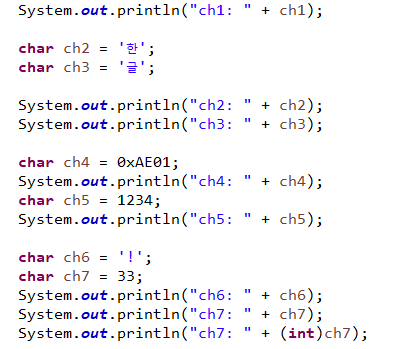 문자 하나(char)는 작은따옴표('')로 묶어 줌. (char literal)