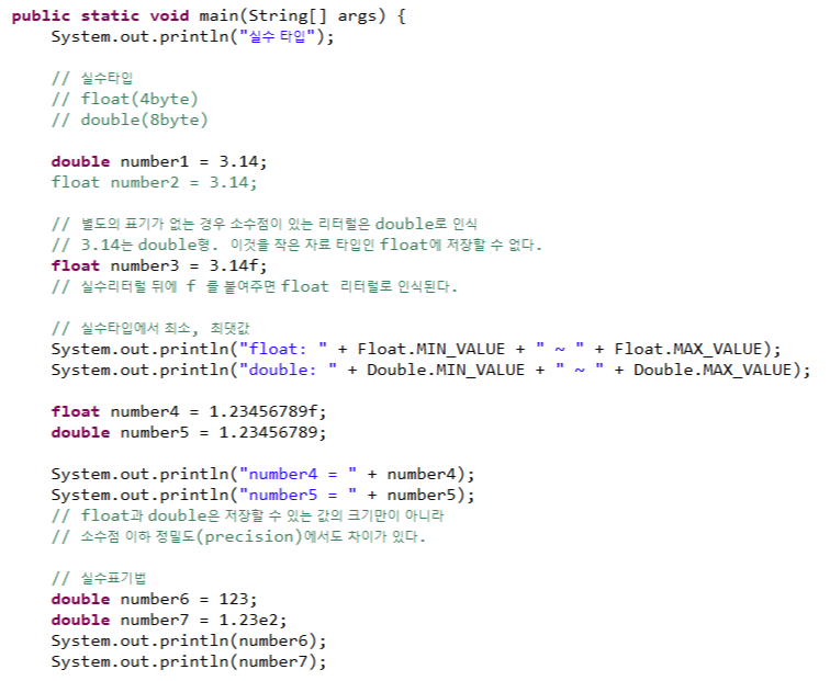 실수 타입: float(4바이트), double(8바이트)